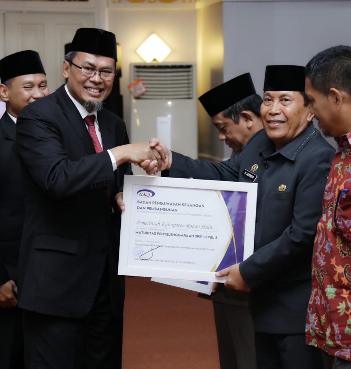 Penghargaan itu langsung diterima Bupati Rohul H Sukiman di dampingi Inspektur Daerah Kabupaten Rohul H Helfiskar, SH, MH serta Sekretaris Inspektorat Alreza Ahyu, SE, M Si Ak dari Deputi Bidang Pengawasan Penyelenggaraan Keuangan Daerah BPKP Pusat Dadang Kurnia, Ak, MBA, CA, CGAP pada kegiatan pengukuhan Kepala BPKP Perwakilan Propinsi Riau, Jumat (21/2/2020) di Balai Pauh Janggi Kompleks Perumahan Gubernur Riau, Kota Pekanbaru.