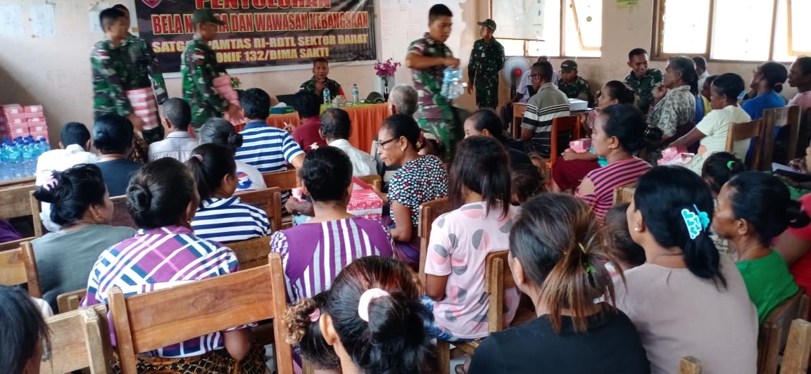 KOBALIMA TIMUR (MR) - Dalam rangka meningkatkan wawasan kebangsaan dan kesadaran bela negara, Satgas Yonif 132/BS, berikan penyuluhan Bela Negara dan Wawasan Kebangsaan kepada masyarakat perbatasan RI-RDTL yang ada di Desa Alas Selatan, Kecamatan Kobalima Timur, Kabupaten Malaka, NTT, Senin (02/03/2020)