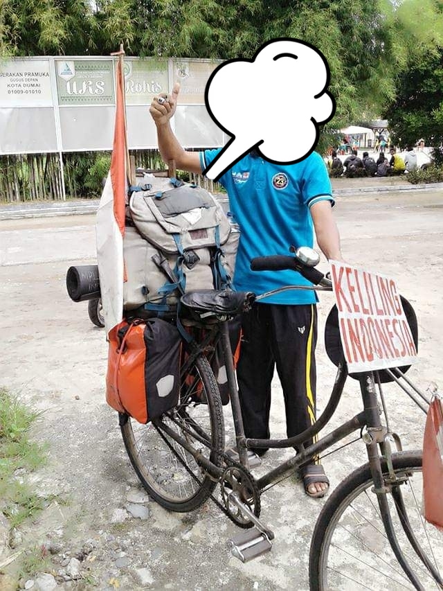 Waktu itu, kebetulan awak media melihat beliau yang saat itu singgah di warung kopi untuk beristirahat dan tengah memperbaiki sepedanya yang memang kelihatan rusak. Yang menarik perhatian, di depan sepeda bertuliskan, keliling indonesia.