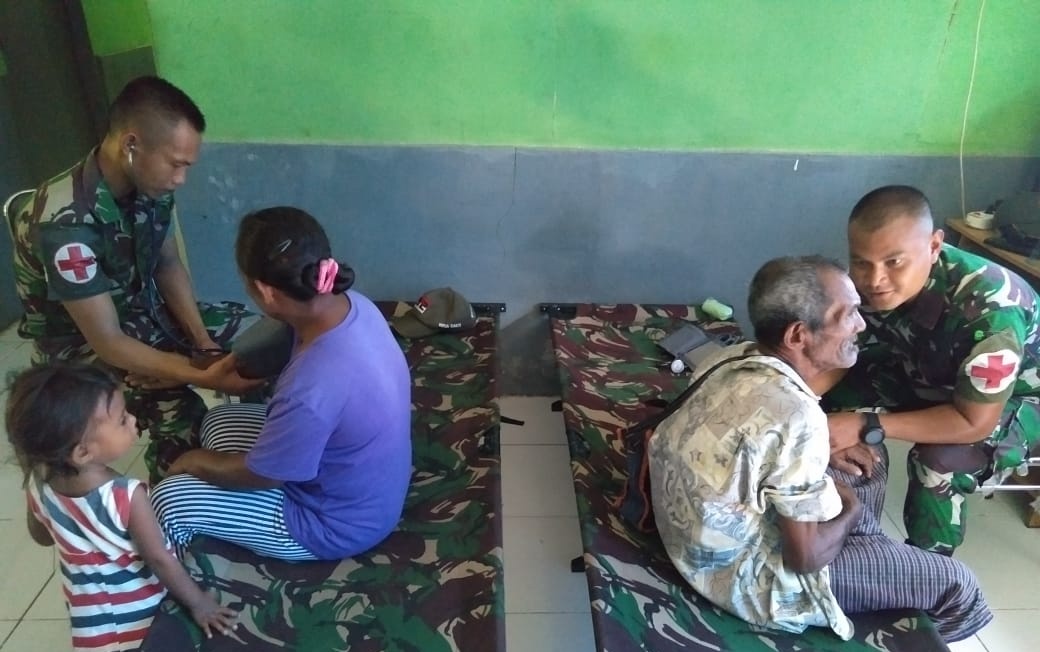 KOBALIMA TIMUR (MR) - Menjamin kesehatan masyarakat yang ada di perbatasan, anggota Satgas Pamtas RI-RDTL Yonif 132/BS jajaran Kipur III pimpinan Lettu Inf Teuku Rhoma DS, menggelar pemeriksaan kesehatan dan pengobatan terbatas gratis untuk masyarakat perbatasan di Desa Alas Selatan, Kecamatan Kobalima Timur, Kabupaten Malaka, Selasa (10/03/2020) .