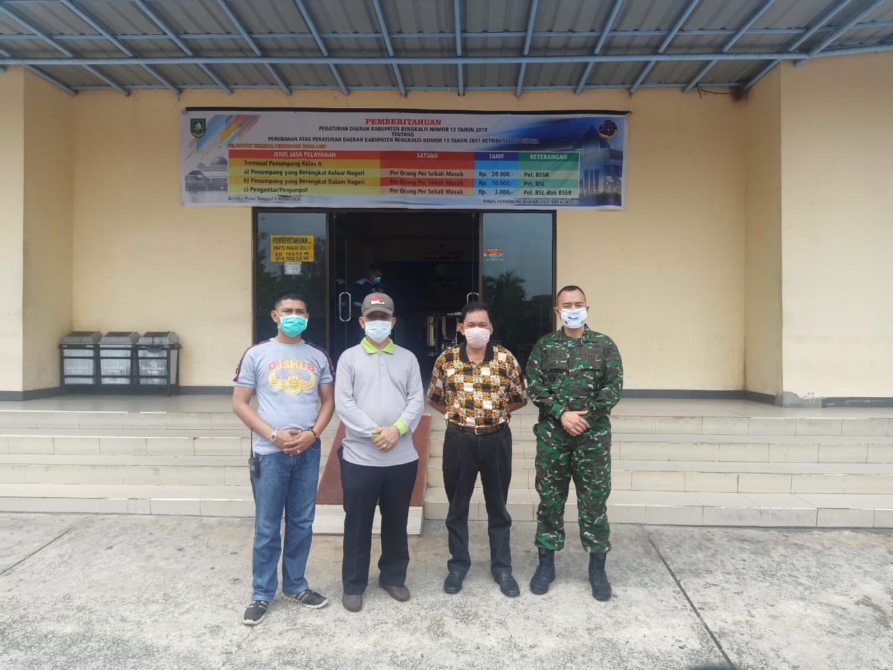 Dandim 0303 Bengkalis bersama Pemerintah Kabupaten Bengkalis menyemprotkan Desinfektan, Minggu, 22 Maret 2020, di pelabuhan Bandar Sri Laksmana (BSL).