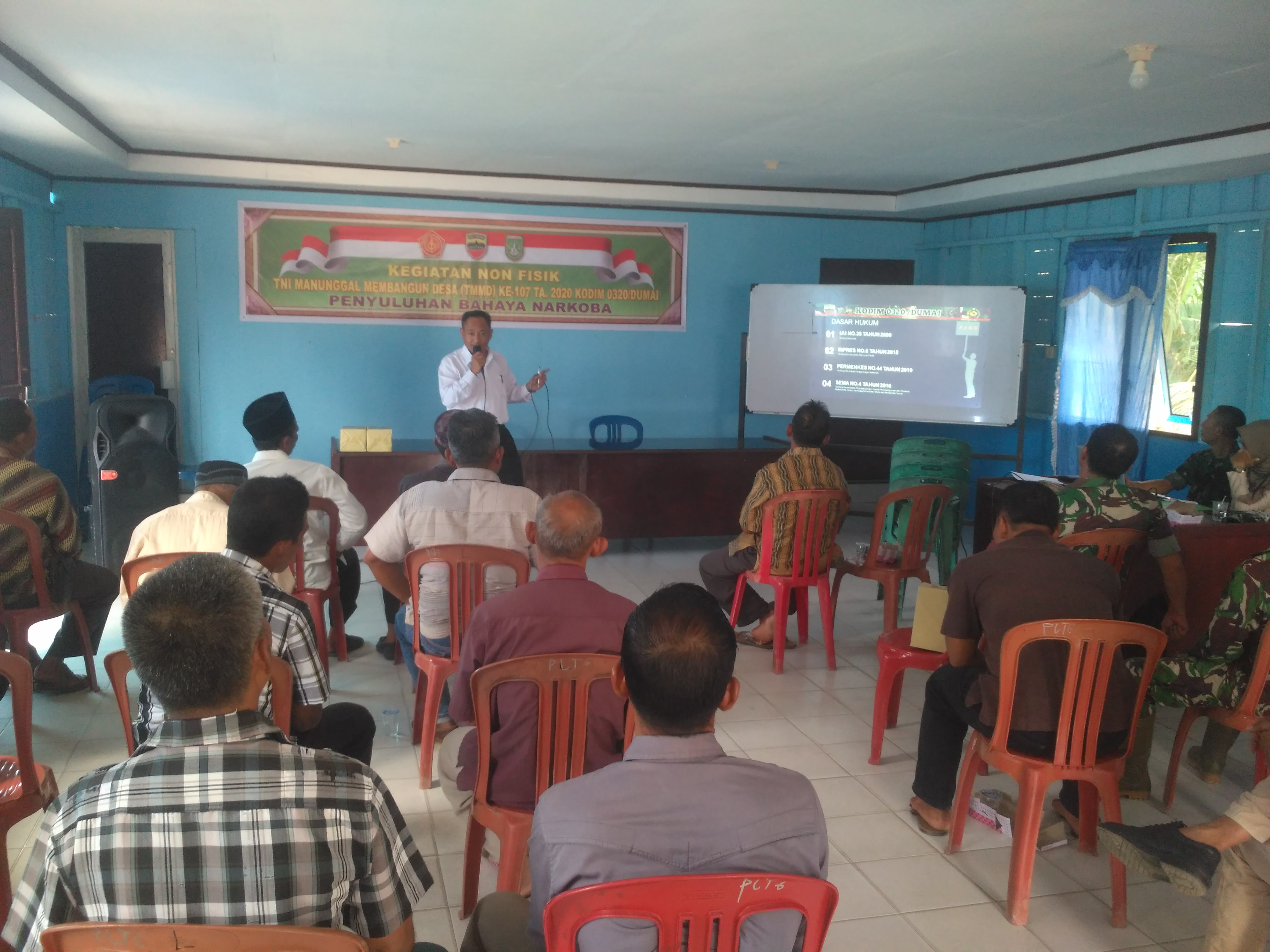 DUMAI (MR) - Menggandeng Detasemen Kesehatan (Denkes) Kodim 0320/Dumai, Satgas TNI Manunggal Membangun Desa (TMMD) yang ke 107 Laksanakan kegiatan penyuluhan bahaya narkoba, Selasa (24/3).