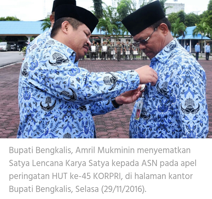 Bupati Bengkalis, Amril Mukminin menyematkan Satya Lencana Karya Satya kepada ASN masa kerja 10 tahun sebanyak 172 orang. Kemudian masa kerja 20 tahun sebanyak 147 orang dan 30 tahun sebanyak 157 orang. Penyematan tersebut disematkan kepada Pelaksana Tugas Sekretaris Daerah, H Arianto masa kerja 20 tahun.