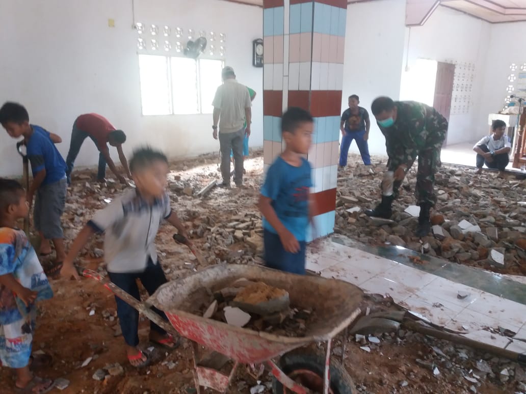 Semangat Satgas dalam merenovasi Mushola Nurul Yakin di jalan Arifin Ahmad tersebut rupanya mendapat perhatian anak-anak di waktu mereka libur sekolah.