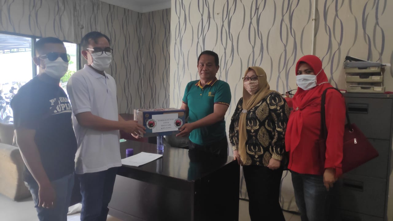 DUMAI (MR) - Ketua DPC PDI Perjuangan Kota Dumai Uber Firdaus, menyerahkan bantuan masker ke Dinas Kependudukan dan Catatan Sipil (disdukcapil) dan Ojek Online Nujek.