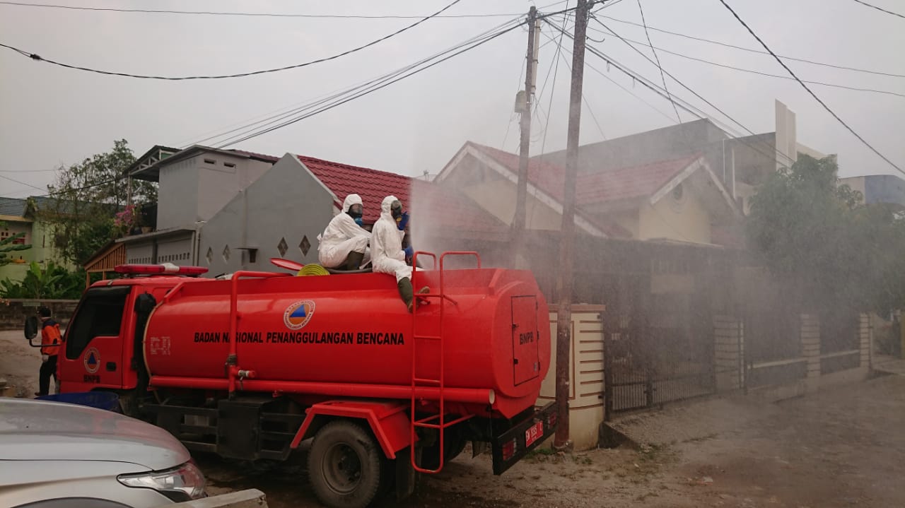 PANGKALAN KERINCI (MR) - Untuk mengantisipasi penularan wabah Corona Virus Desease (Covid19), lingkungan beserta rumah pasien positif Covid19 di Pangkalan Kerinci, Kabupaten Pelalawan, Riau, dilakukan penyiraman desinfektan, Kamis (2/4).