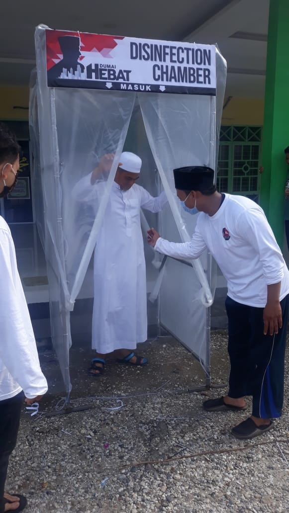 Saat awak media menyambangi Hendri sandra. SE mengatakan,"sebelum jamaah memasuki mesjid hendaklah jamaah melewati bilik disinfeksi agar pakaian jemaah steril dari virus, Disinfection Chamber ini adalah salah satu upaya kita untuk pencegah virus covid 19, bahan cairan yang diguna adalah dettol agar lebih aman digunakan bagi kulit manusia."ujarnya.