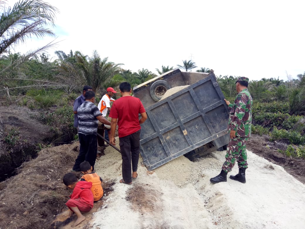 "Akibat curah hujan yang tinggi jalan yang dilalui oleh truk Langsiran ini menjadi lunak dan tak tahan untuk menahan bobot truk Langsiran sehingga kondisi seperti ini terjadi, namun berkat kerjasama yang baik antara satgas dan masyarakat truk tersebut bisa diangkat kembali," Katanya.