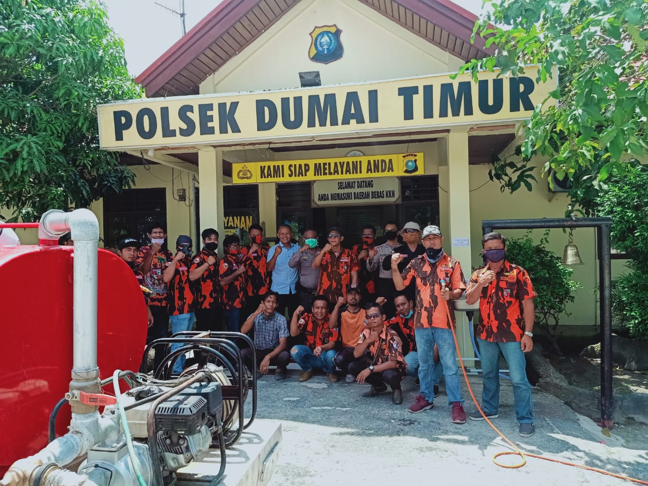 Pantauan monitorriau.com, Pengurus PAC PP Dumai Timur bersama Polsek Dumai Timur melakukan penyemprotan di seluruh bagian Mapolsek Dumai Timur.