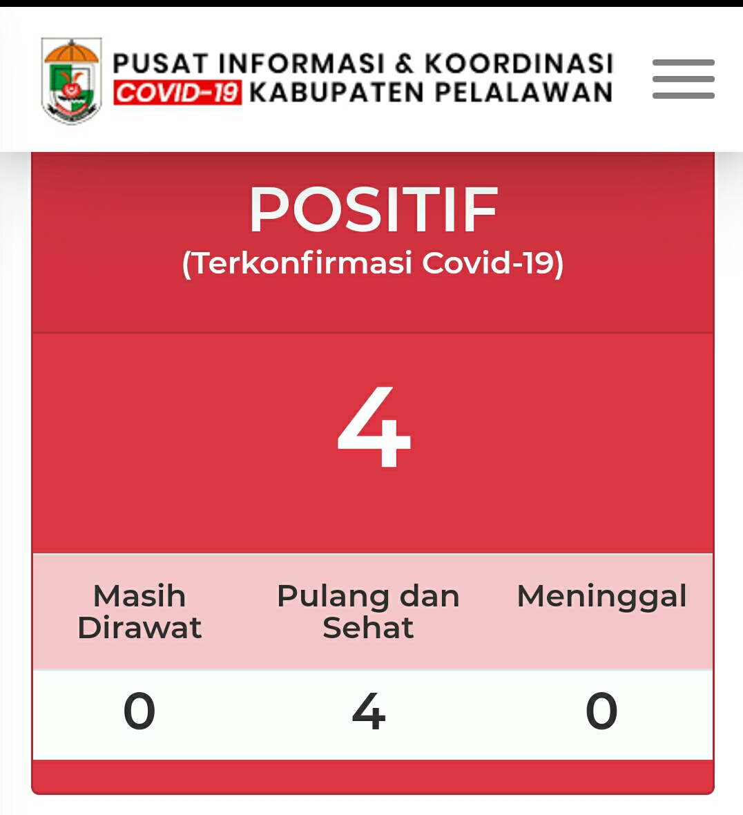 "Total pasien positif kita empat orang. Ini yang keempat atau terakhir. Jadi seluruh pasien positif telah dinyatakan sembuh," ujar Asril.
