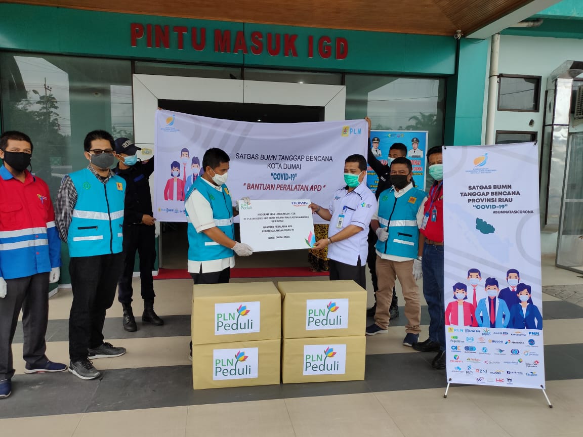 DUMAI (MR) - PT PLN (Persero) Unit Pelaksana Pelanggan (UP3) Kota Dumai, Rabu (06/05/2020) menyerahkan alat pelindung diri (APD) kepada Rumah Sakit Umum Daerah (RSUD) Kota Dumai. Bantuan APD tersebut sebagai bentuk dukungan PT PLN UP3 Kota Dumai kepada tim medis dalam penanganan Covid-19.