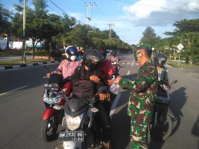 Bertempat di Makodim 0320/Dumai, di Jalan Sultan Syarif Kasim kelurahan Teluk Binjai, Jum'at (15/5), seluruh prajurit kodim turun untuk membagikan takjil kepada pengendara roda dua dan pejalan kaki yang melintas.