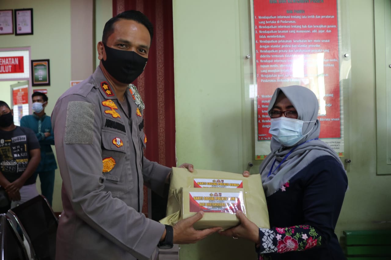 DUMAI (MR) - Dalam rangka memperingati Hari Bhayangkara Ke - 74 Tahun 2020, Polres Dumai menggelar Bakti Sosial kepada tenaga medis di Puskesmas Jaya Mukti, Jumat (18/06/2020).