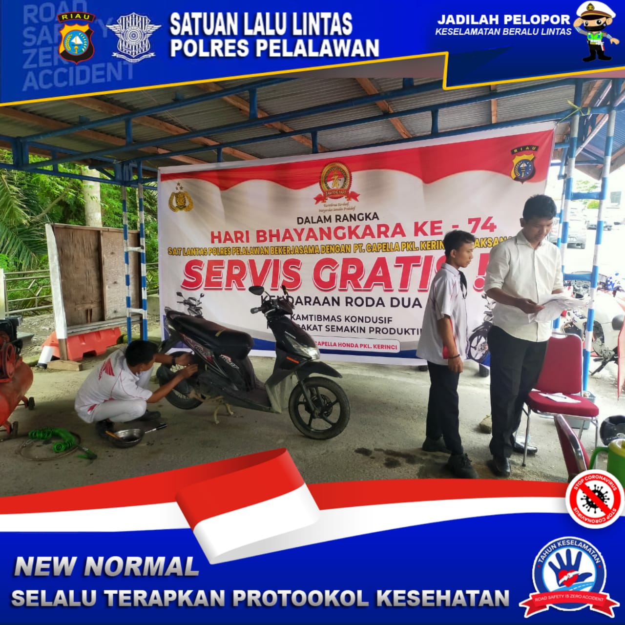 PANGKALAN KERINCI (MR) - Dalam rangka menyambut Hari Bhayangkara Ke-74, Satuan Lalu Lintas (Satlantas) Polres Pelalawan menggelar service gratis bagi kendaraan bermotor roda dua.