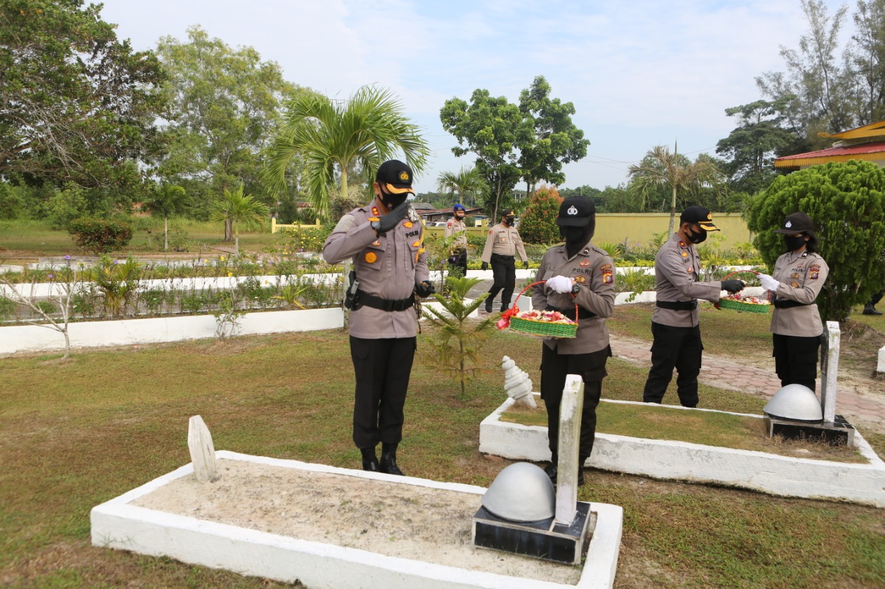 DUMAI (MR) - Senin pagi (29/6/2020) sekira pukul 07.30 WIB, Para Pejabat Utama Polres Dumai dan Para Kapolsek Jajaran Polres Dumai melaksanakan Upacara Ziarah dan Tabur Bunga di Taman Makam Pahlawan Damai Sentosa Kota Dumai dalam rangka Hari Bhayangkara Ke-74 Tahun 2020.
