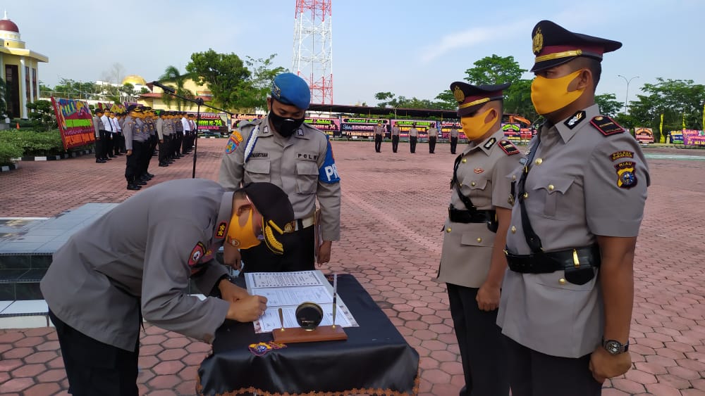 BANJAR XII (MR) - Kapolres Rohil AKBP Nurhadi Ismanto,SH.SIK menjadi Irup Upacara Serah Terima Jabatan (Sertjab) Kapolsek Rantau Kopar Serta kenaikan pangkat sebanyak 43 personil di halaman Mapolres Rohil,Rabu (01/07) Jalan Lintas Riau-Sumut Kecamatan Tanah Putih.