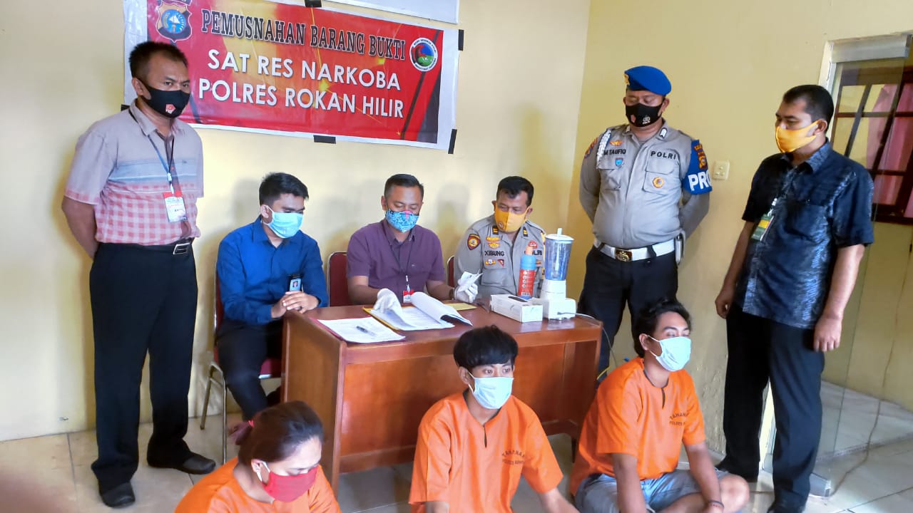 Satuan Narkoba Polres Rohil usai melakukan pemusnahan Barang Bukti (BB) narkotika jenis shabu seberat 37.42 Gram dari 3 tersangka,Selasa (14/07) di ruang Sat Narkoba Polres Rokan Hilir dengan cara di blender dan di campur dengan Detergent lalu cairan di buang ke dalam safety Tank.