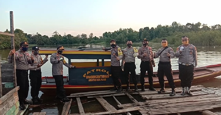 BANJAR XII (MR) - Kapolres Rohil AKBP Nurhadi Ismanto,SH memberikan apresiasi dan penghargaan atas kinerja Inovasi kreatif Bhabinkamtibmas Polsek Pujud, Kepenghuluan Air Hitam, Kecamatan Pujud Bripka Syaiful Bahri yang membuat perahu patroli pemantau Kebakaran Hutan dan Lahan (Karhutla).