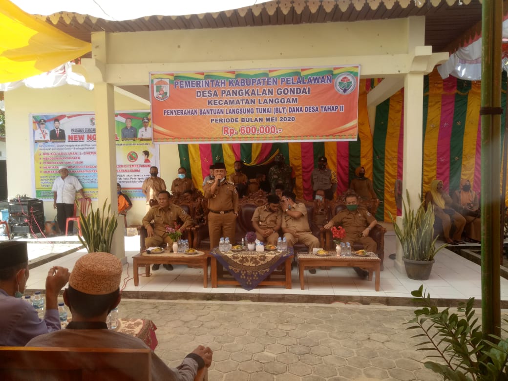Bupati Pelalawan HM. Harris dalam sambutannya menyampaikan “Desa Pangkalan Gondai termasuk desa yang mana kepadatan penduduknya termasuk salah satu yang terbanyak diantara desa lainnya di Kecamatan Langgam. Dapat diketahui bersama bahwa pada hari ini merupakan salah satu kegiatan pemerintah untuk memberikan bantuan BLT di Desa Pangkalan Gondai dari 8 desa termasuk kelurahan yang ada di Kecamatan Langgam. Semoga bantuan yang diberikan dapat dimanfaatkan sebaik mungkin oleh penerima bantuan dalam rangka meringankan beban masyarakat karena terdampak wabah Covid-19. Kepada masyarakat saya juga berpesan dalam menghadapi situasi new normal ini dengan tetap menjalankan protokol kesehatan agar terhindar dari penyebaran virus Covid-19.”