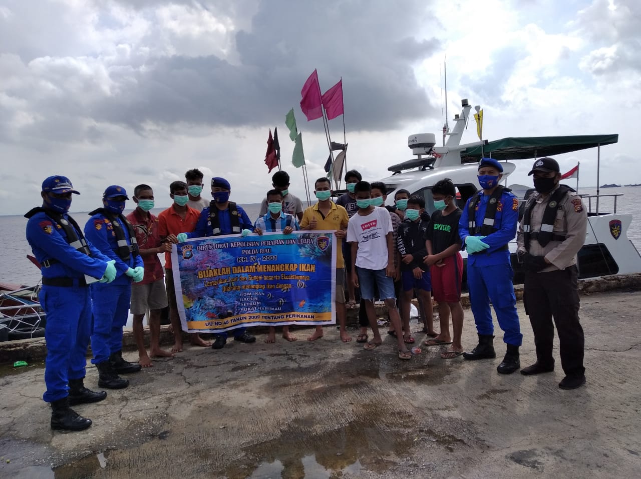 Aiptu Aswanto mengungkapkan, kegiatan ini dilaksanakan bersama crew serta mendistribusikan masker N-95 kepada masyarakat nelayan di TPI Purnama dalam rangka penerapan adaptasi baru Covid 19, juga pemahaman bijak dalam menangkap ikan dan sosialisasi Karlahut.