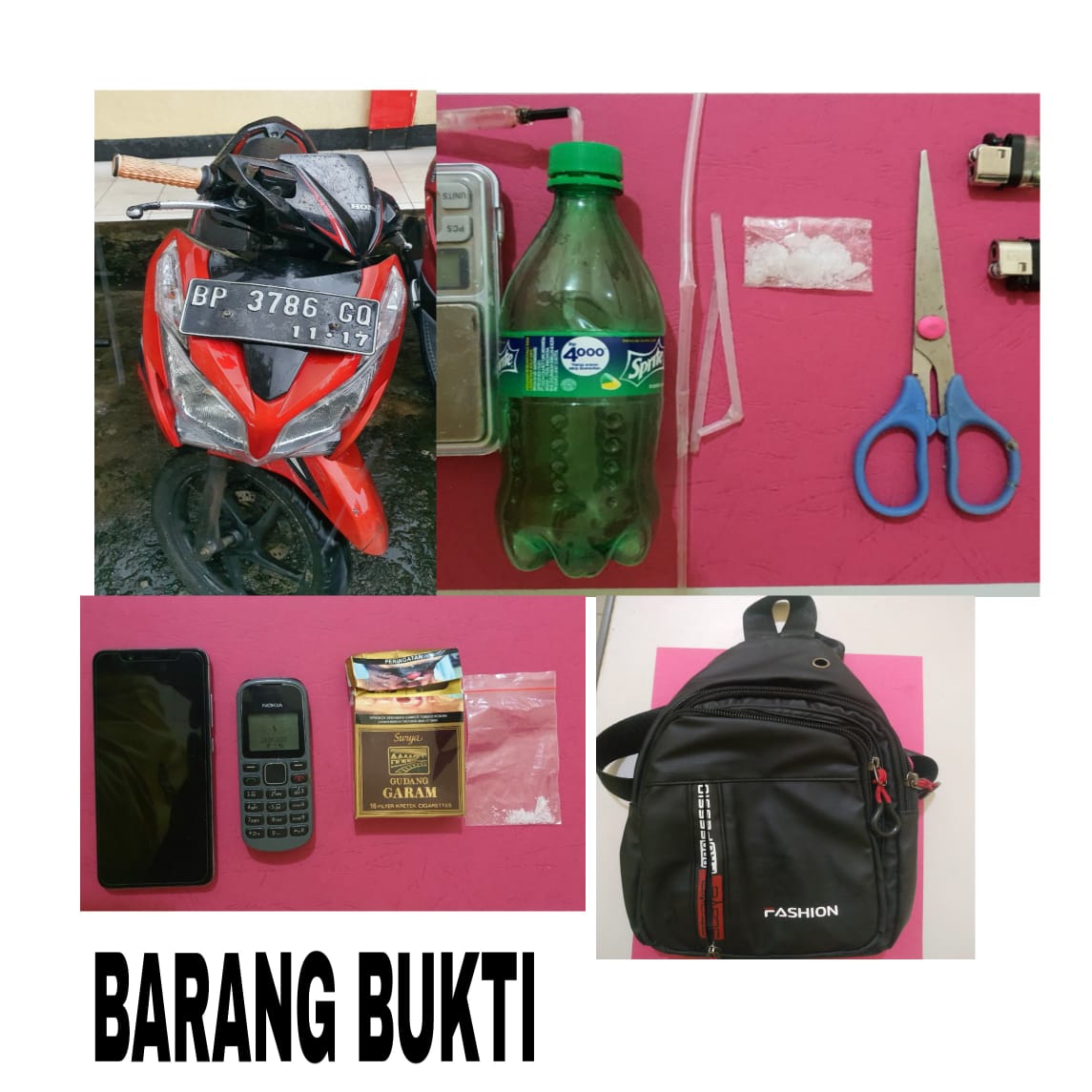 Hasilnya, ditemukan di dalam dashboard sepeda motor 1 (satu) buah kotak rokok merk Surya Gudang Garam warna Coklat yang saat dibuka berisi 1 (satu) paket diduga Narkotika Golongan I bukan Tanaman jenis sabu yang dibungkus plastik transparan, dan 1 (Satu) unit Handphone merk Xiaomi warna Silver beserta kartu didalamnya, serta 1 (Satu) unit handphone merk Nokia warna Abu Abu beserta kartu didalamnya.