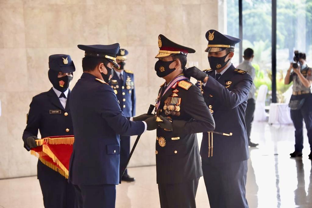 JAKARTA (MR) - Panglima TNI Marsekal Hadi Tjanjanto menganugerahi Kapolri Jenderal Idham Azis tiga bintang utama yaitu Kartika Eka Paksi Utama, Jalasena Utama dan Swa Bhuana Utama. Upacara penganugerahan digelar di Ruang Hening, Mabes TNI, Cilangkap, Jakarta Timur, Selasa (28/7).
