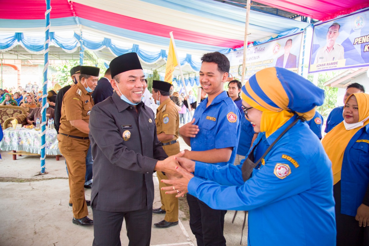 LABUHANBATU (MR) - Bupati Labuhanbatu H.Andi Suhaimi Dalimunthe ST.MT Didampingi ketua Tim Penggerak PKK Kabupaten Labuhanbatu Hj.Rosmanidar Hasibuan menghadiri pelantikan kepengurusan Karang Taruna Kelurahan Sidorejo, Kecamatan Rantau pada Senin (27/07/2020) di Balai Pertemuan Dusun Bulucina.