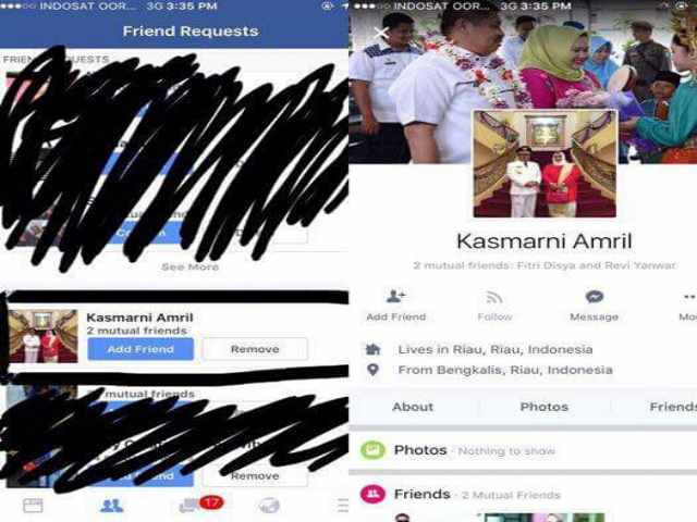 BENGKALIS (MR) - Istri dari Bupati Bengkalis Kasmarni Amril menghimbau dari Akun FB milik pribadi kepada seluruh Masyarakat Kabupaten Bengkalis agar berhati - hati dikarenakan ada yang menggunakan akun FB Palsu yang mengatasnamakan dirinya.