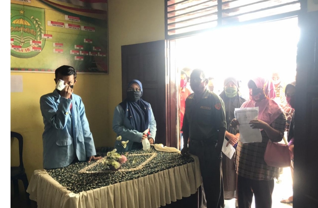 Sebelum pembagaian BLT Tahap III dilaksanakan, mahasiswa Kukerta Balek Kampung membantu pemeriksaan kelengkapan administrasi serta penyemprotan hand sanitezer pada kedua telapak tangan warga yang hendak mengambil BLT.