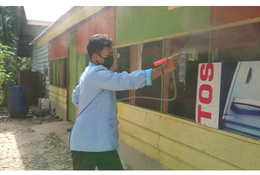 PINGGIR (MR) - Tim Pengabdian Kukerta Balek Kampung UNRI Melakukan penyemprotan disinfektan yang dibantu Oleh pemerintahan desa serta beberapa masyarakat setempat.