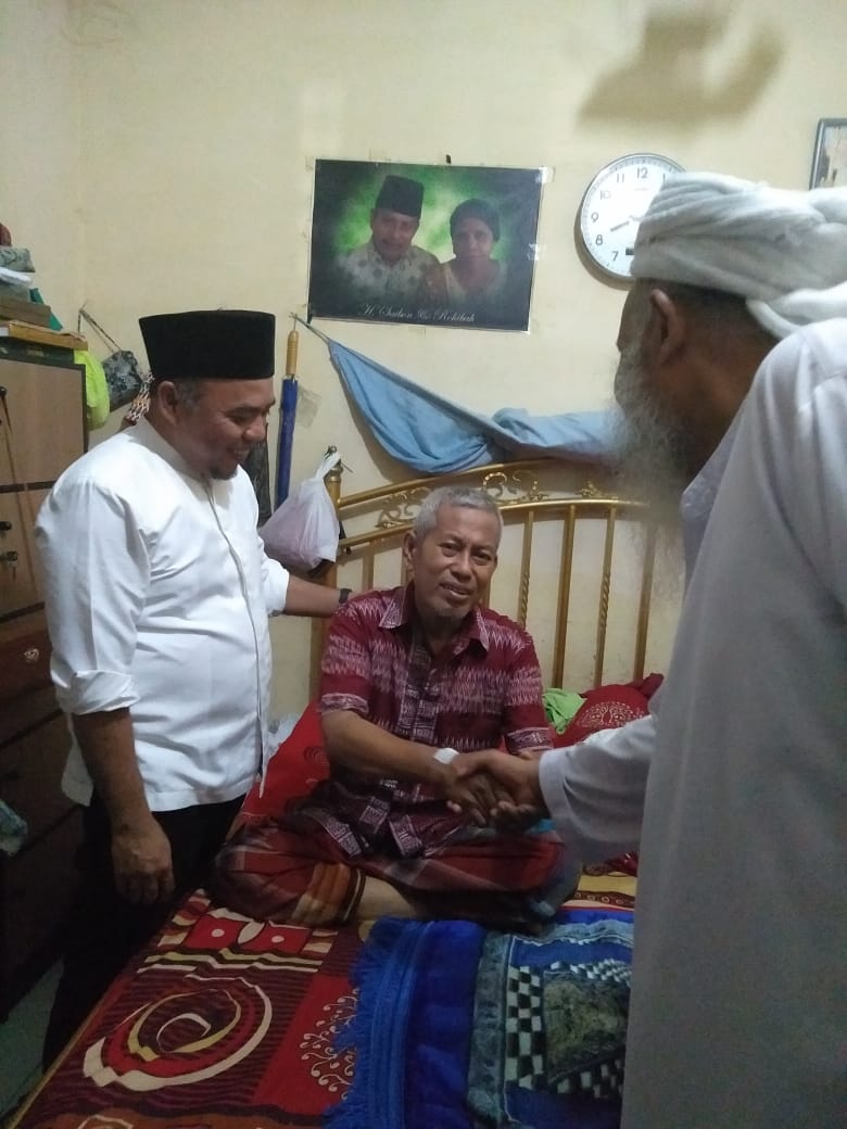 LABUHANBATU (MR) - Bupati Labuhanbatu H.Andi Suhaimi Dalimunthe, ST.MT didampingi Para Ulama menjenguk Imam Masjid Baitul Muhsinin H.Saibon Nasution yang sedang terbaring sakit di kediamannya Jln. SM.Raja, Kelurahan Bakaran Batu, Kecamatan Rantau Utara pada Minggu (06/09/2020).