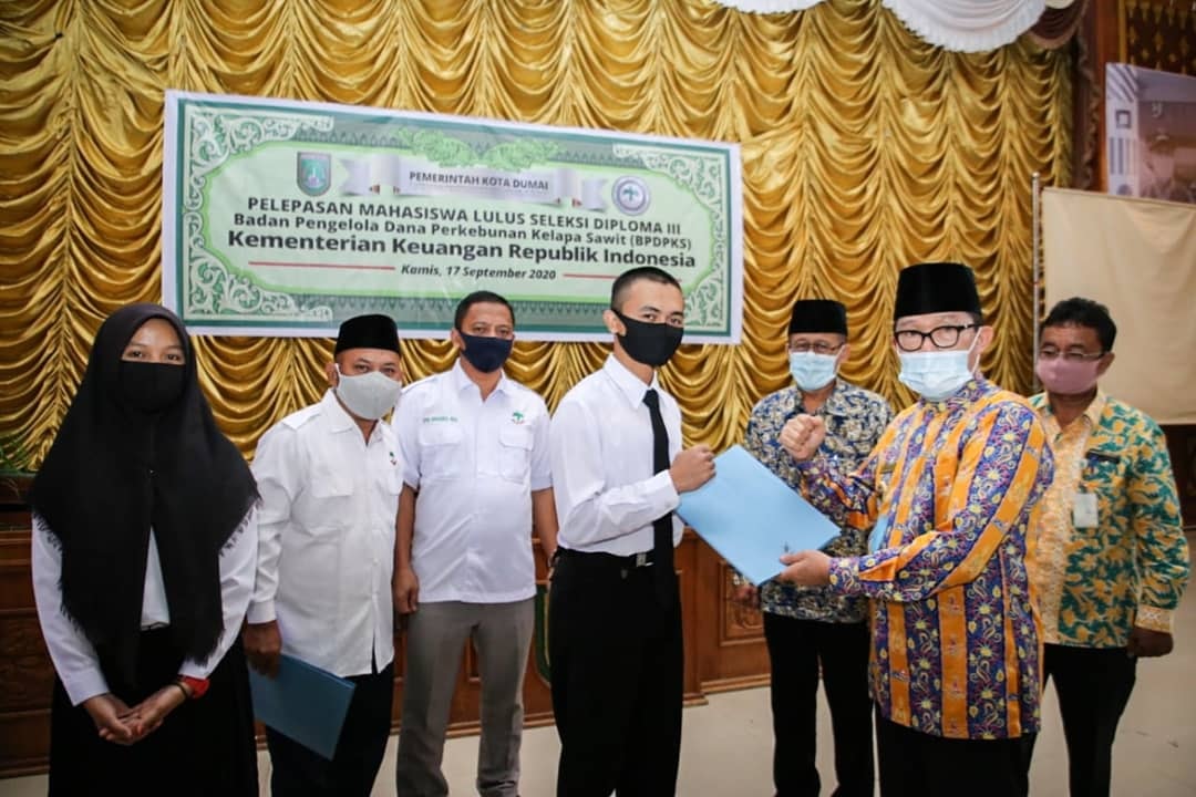 DUMAI (MR) - Walikota Dumai, H Zulkifli AS menghadiri Pelepasan Mahasiswa Lulus Seleksi Beasiswa kepada Anak-anak Petani Binaan Asosiasi Petani Kelapa Sawit Indonesia (APKASINDO), bertempat di Gedung Sri Bunga Tanjung Dumai, Kamis (17/09/2020).