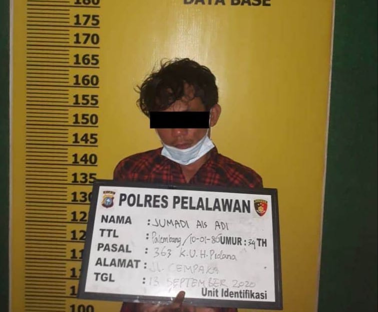 Pelaku JE ditangkap karena adanya dugaan melakukan pencurian satu unit sepeda motor merk honda supra dengan nomor polisi BM 5526 IE, tahun 2014 dari lokasi Jalan Langgam KM 9, Desa Rantau baru, Kabupaten Pelalawan, Senin (21/9).