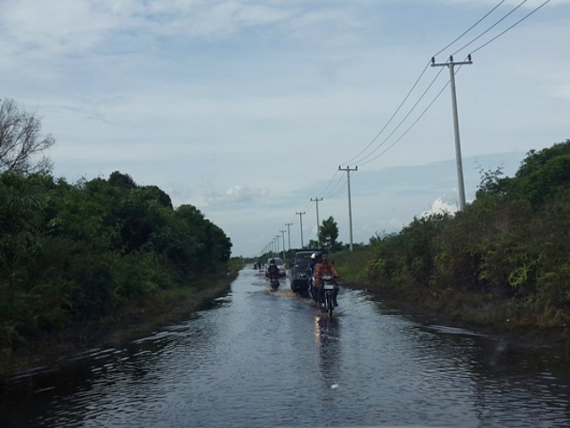 Jika di kawasan Parit 1 Api-Api hanya berlubang, jalan rusak antara Sepahat dan Tanjung Leban tersebut juga “ditambah” dengan terendam banjir.
