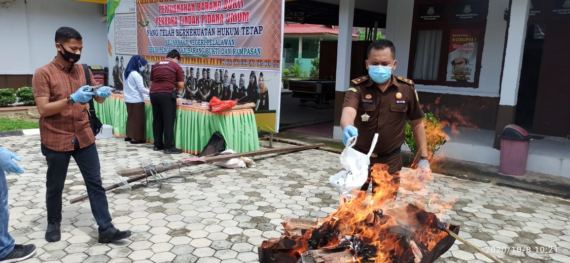 PANGKALAN KERINCI (MR) - Pemusnahan barang bukti perkara Tindak Pidana Umum (Pidum) yang telah memperoleh kekuatan hukum tetap (ingkrah) dilaksanakan di halaman Kantor Kejaksaan Negeri (Kejari) Pelalawan, Pangkalan Kerinci, Kamis (8/10).