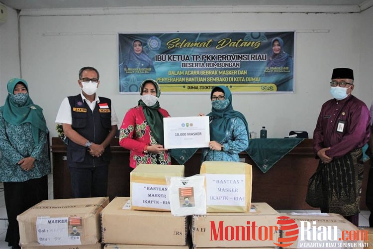 DUMAI - Ketua Tim Penggerak Pemberdayaan dan Kesejahteraan Keluarga (TP-PKK) Riau, Misnarni menyerahkan bantuan 10 ribu masker kain kepada Ketua TP PKK Dumai, Haslinar Zulkifli di aula kantor Kecamatan Bukit Kapur, Kota Dumai. Adapun penyerahan bantuan ini merupakan rangkaian kegiatan Gebrak Masker di Riau.