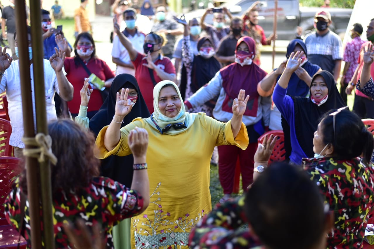 DURI (MR) - Tak lelah menyapa warga, calon bupati Bengkalis nomor urut 3 Kasmarni, S.Sos, MMP, Jumat (13/11/2020) berkeliling kampanye tatap muka di sepanjang Jalan Gajah Mada, Kelurahan Talang Mandi, Kecamatan Mandau. Ada 9 titik kampanye yang didatangi Kasmarni dari pagi hingga malam nanti. Disetiap titik yang didatangi, warga antusias dan yakin Kasmarni bakal jadi bupati.