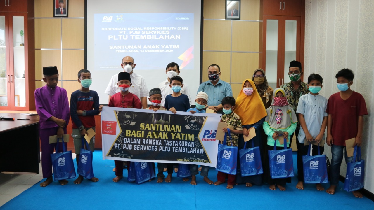 TEMBILAHAN (MR) - PT PJB Services PLTU Tembilahan menyantuni sejumlah anak yatim piatu, Senin (14/12/2020). Kegiatan kemanusiaan tersebut dilakukan sebagai wujud implementasi tanggung jawab sosial perusahaan (CSR) PLTU Tembilahan.