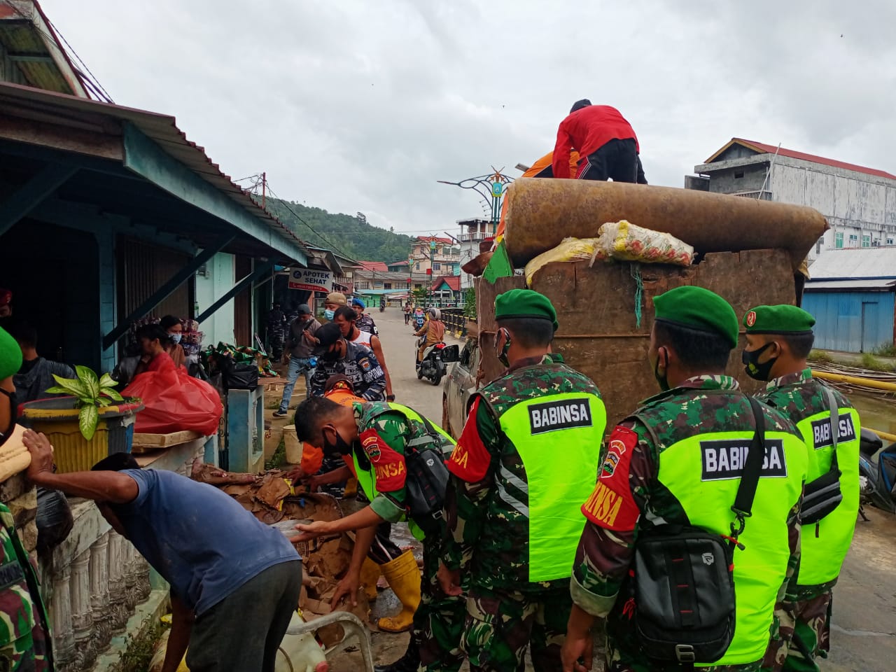 "Hari ini kami bersama masyarakat melaksanakan pembersihan pemukiman warga dan membersihkan sisa - sisa lumpur dan mengangkat barang -barang masyarakat yang basah akibat terendam air pasca banjir " ungkap kapten dede.
