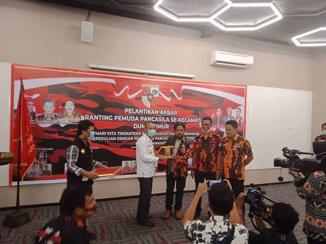 DUMAI (MR) - Dalam acara pelantikan akbar 5 ranting Pemuda Pancasila se Kecamatan Dumai Timur Rabu (13/01/2021) kemarin, Pemerintah Kota Dumai yang diwakili Camat Dumai timur Zulfahren S.Sos, M.Si, menyerahkan plakat.
