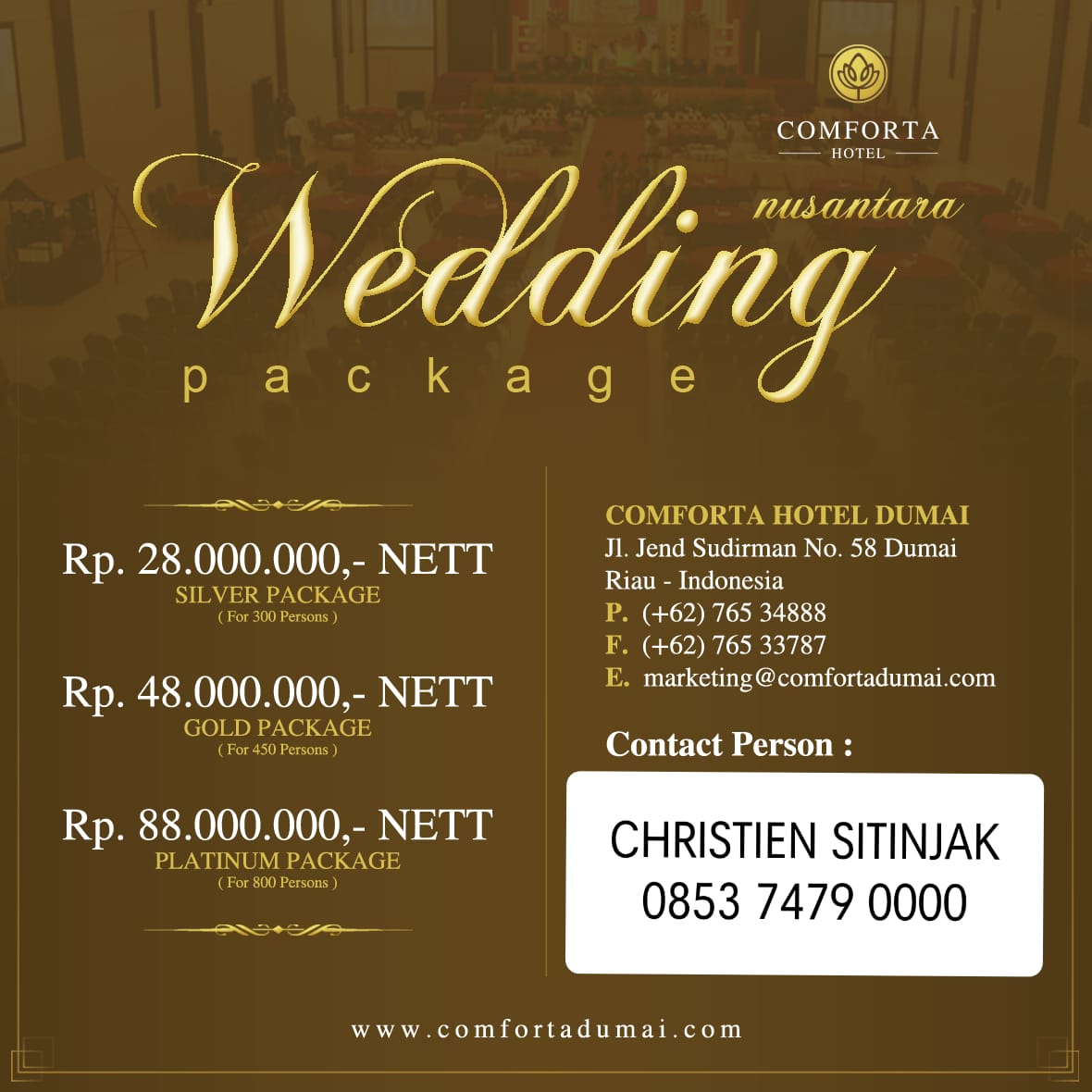 "Semua menu baru khas Nusantara ini merupakan menu yang dibuat khusus oleh chef Hotel Comforta yang telah memiliki pengalaman bertahun-tahun, pastinya higienis dan halal. Bagi masyarakat atau pengunjung yang menginap di hotel Comforta yang ingin merasakan sensasi menu wedding package ciatok dapat melakukan reservasi langsung di Hotel Comforta Dumai jalan jenderal Sudirman no.58" tutur Christien Sitinjak selaku Sales & Marketing Manager hotel Comforta Dumai.