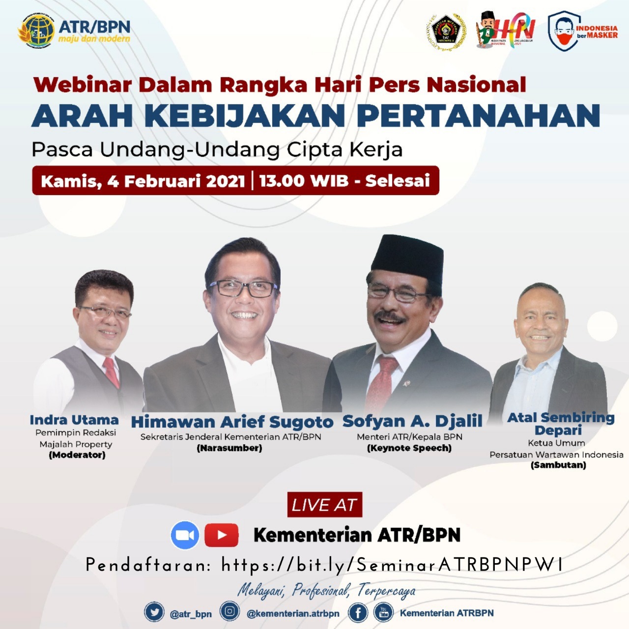 JAKARTA (MR) – Rangkaian Hari Pers Nasional (HPN) 2021, Kementerian Agraria Tata Ruang/Badan Pertanahan Nasional (ATR/BPN) menggelar webinar, bertema, "Arah Kebijakan Pertanahan Pasca Undang-Undang Cipta Kerja", yang akan digelar, Kamis ( 4/2/2021) besok siang.