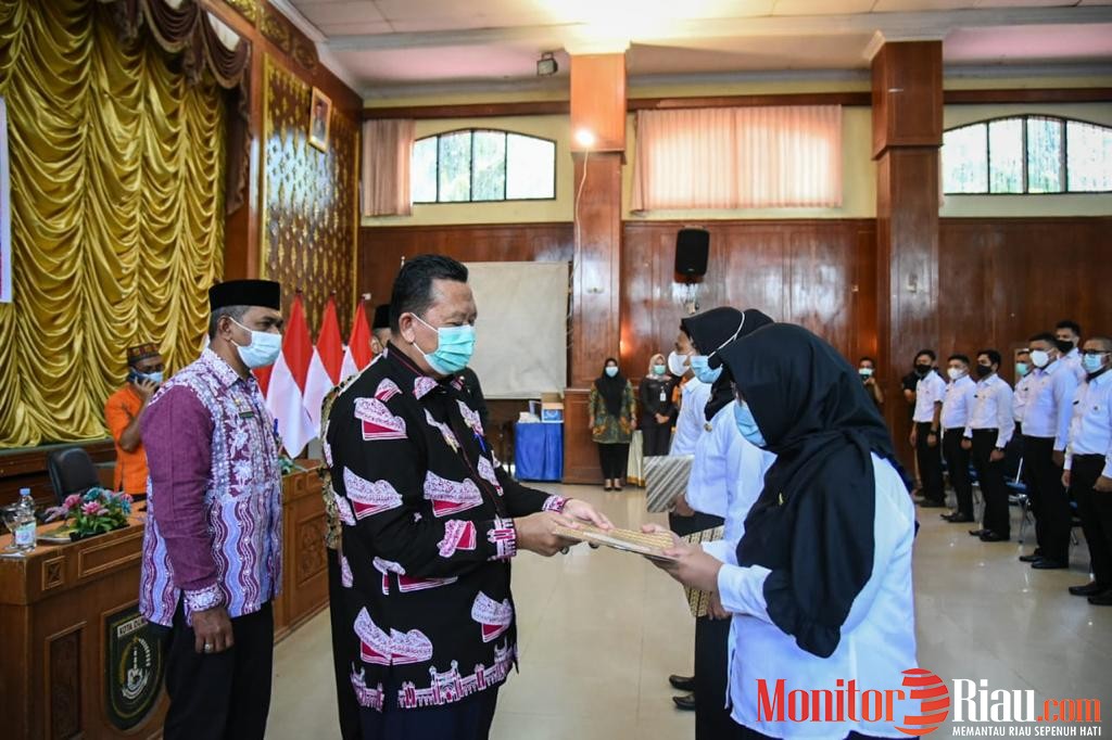 DUMAI (MR) - Pj. Walikota Dumai H. Jonli menyerahkan Surat Keputusan (SK) Calon Pegawai Negeri Sipil (CPNS) Formasi Tahun 2019 kepada CPNS yang lulus seleksi yang bertempat di Gedung Sri Bunga Tanjung, Kamis (10/02/2021).