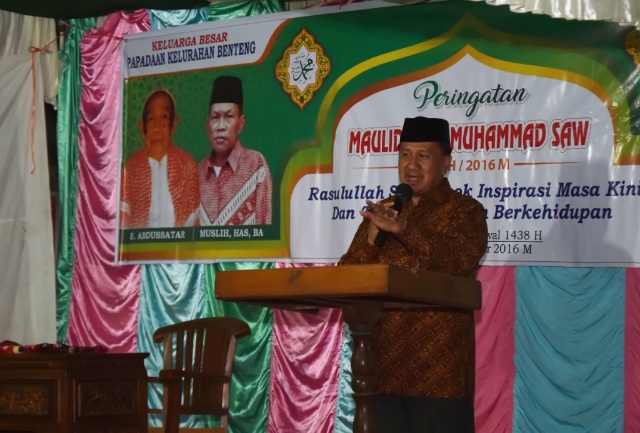 TEMBILAHAN (MR) - Wakil Bupati (Wabup) Indragiri Hilir (Inhil) H Rosman Malomo menghadiri peringatan Maulid Nabi Muhammad SAW di Keluarahan Benteng Kecamatan Sungai Batang, Jum’at (30/12/2016) malam.