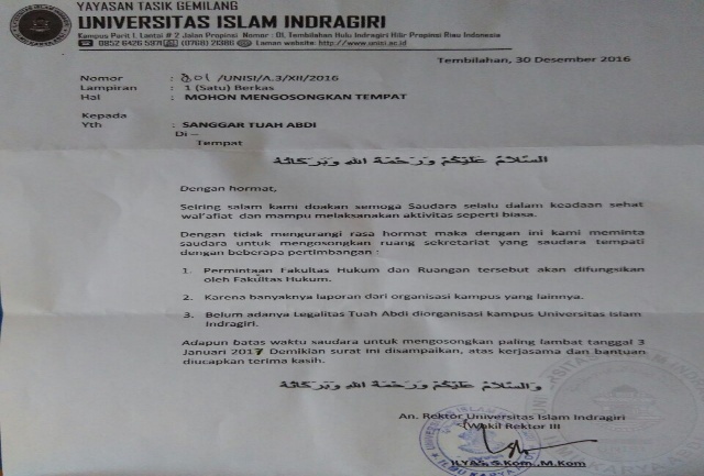 Diakhir tahun 2016, tepatnya pada tanggal 30 Desember 2016, surat resmi UNISI terbit dengan nomor: 801/UNISI/A.3/XII/2016 yang ditujukan kepada Sanggar Tuah Abdi tentang permohonan pengosongan tempat. Surat itu ditanda tangani oleh Wakil Rektor III UNISI bidang Kemahasiswaan, Ilyas S.Kom M.Kom.