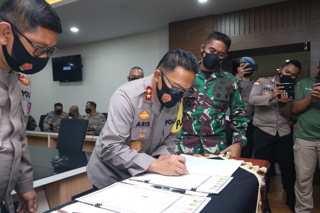Selesai pelaksanaan Rapat Koordinasi dilanjutkan dengan Penandatanganan Perjanjian Kerja Sama antara TNI-Polri diwilayah Provinsi Kepri.