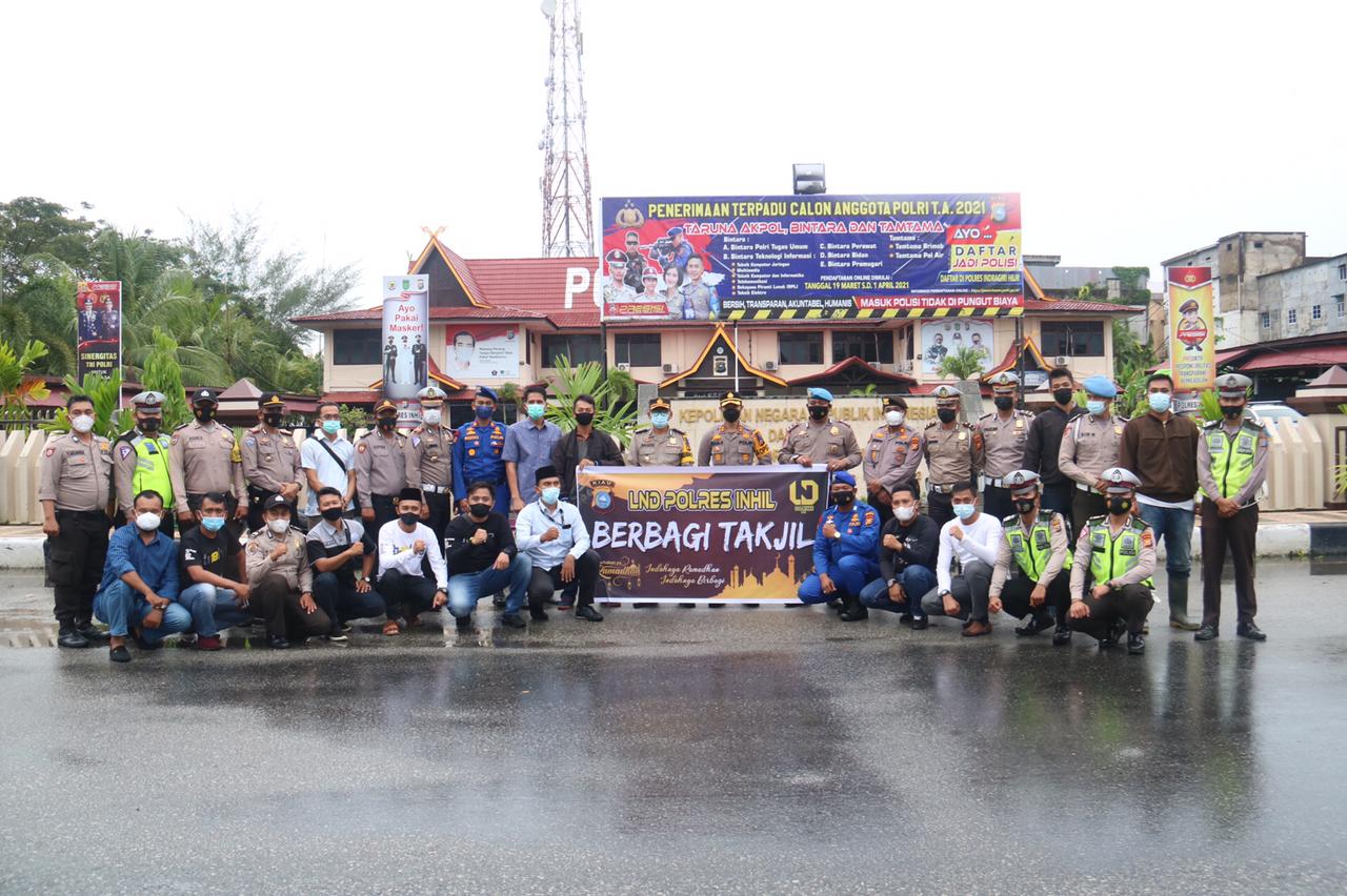 TEMBILAHAN (MR) - Kapolres Indragiri Hilir AKBP Dian Setyawan, S.H, S.i.k, M.Hum Bersama Ketua Bhayangkari Cabang Inhil, PJU Polres Inhil dan Bintara Letting 2008 LND Polres Inhil Melaksanakan Pembagian Takjil Kepada Masyarakat Kota Tembilahan.