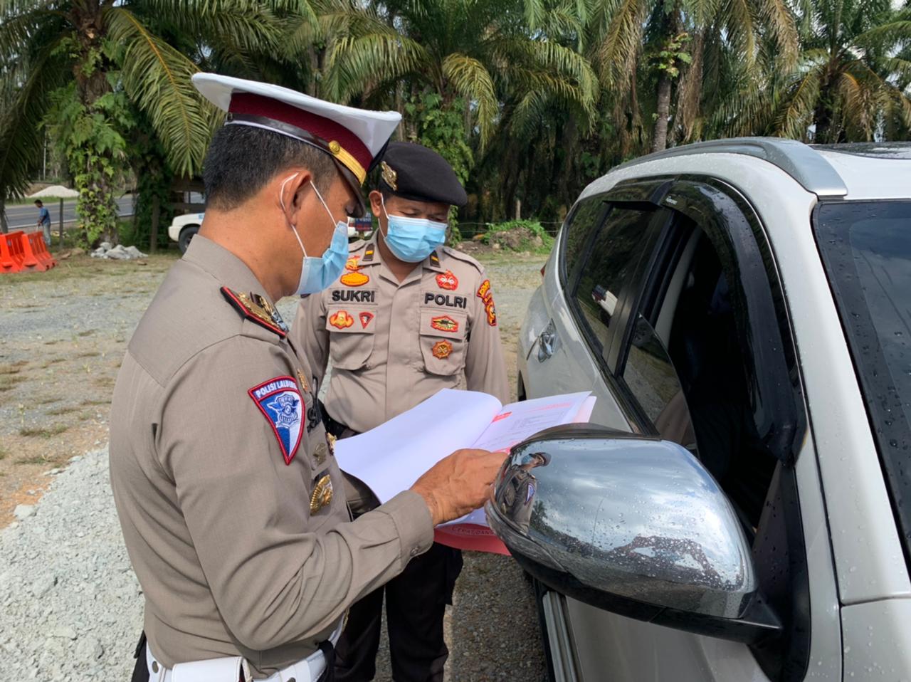 "Petugas memberhentikan kendaraan pribadi dan transportasi umum dari arah Jambi menuju Riau dan sebaliknya, untuk kemudian dilakukan pemeriksaan izin perjalanan dan dokumen kesehatan pelaku perjalanan dalam negeri," ungkapnya.