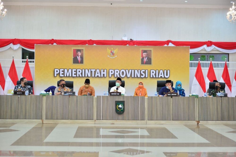 PEKANBARU (MR) - Gubernur Riau (Gubri) Syamsuar memimpin rapat koordinasi (rakor) terkait vaksinasi bersama Ketua Paguyuban dan tokoh agama Provinsi Riau di Gedung Daerah Balai Serindit, Jumat (21/5/2021).
