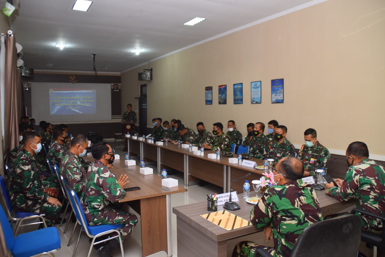 TANJUNG PINANG (MR) - Komandan Pangkalan Udara TNI Angkatan Laut (Danlanudal) Tanjungpinang Kolonel Laut (P) Heru Prasetyo didampingi Komandan Wing udara 1 Kolonel Laut (P) Imam safii melaksanakan brefing akhir dan penutupan uji petik Gladi Tugas Tempur (Glagaspur) tingkat pangkalan P1-P2 dan U1-U2 Wing Udara 1 di Ruang rapat Mako Wingudara 1 Tanjungpinang, Kamis(27/05).